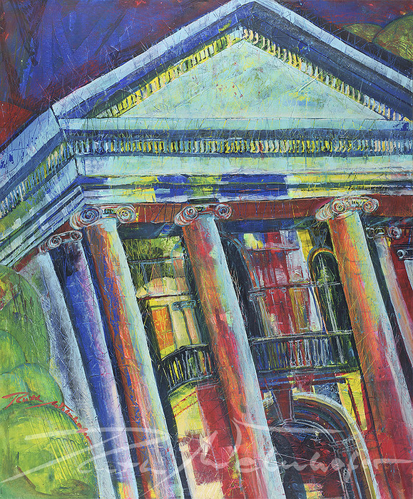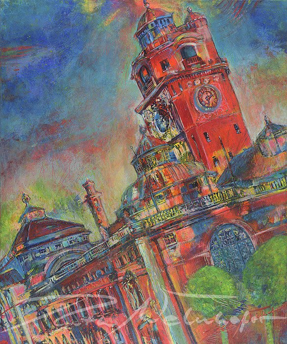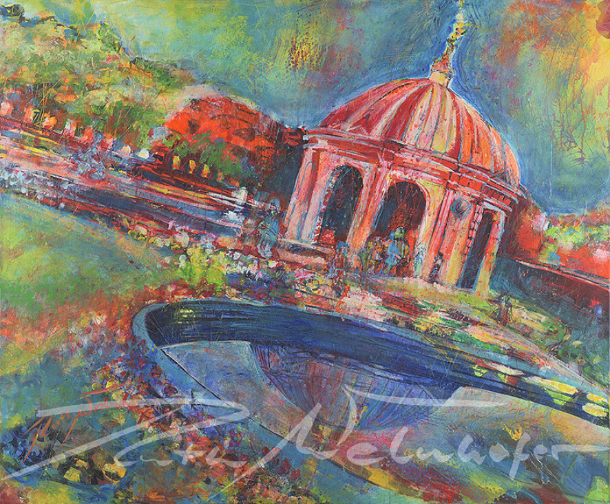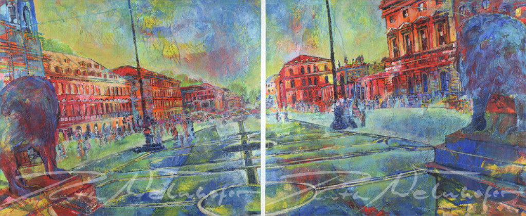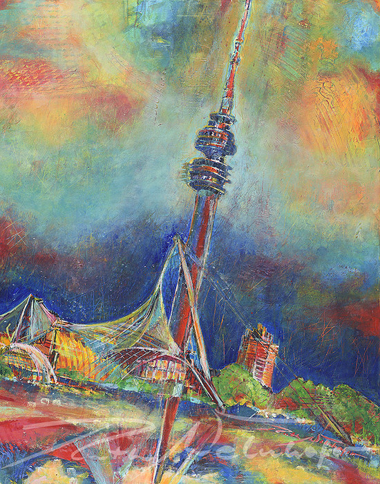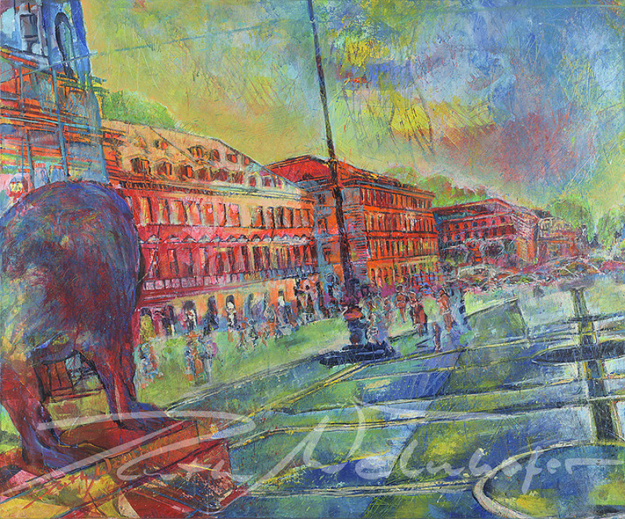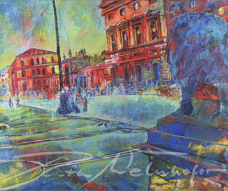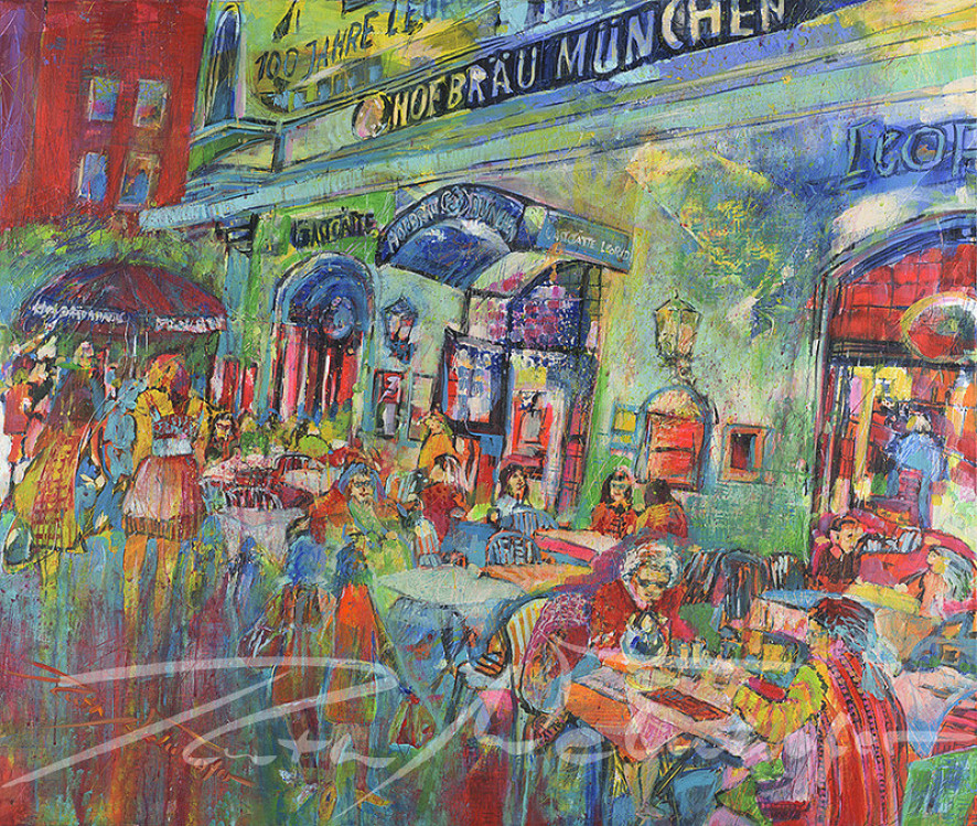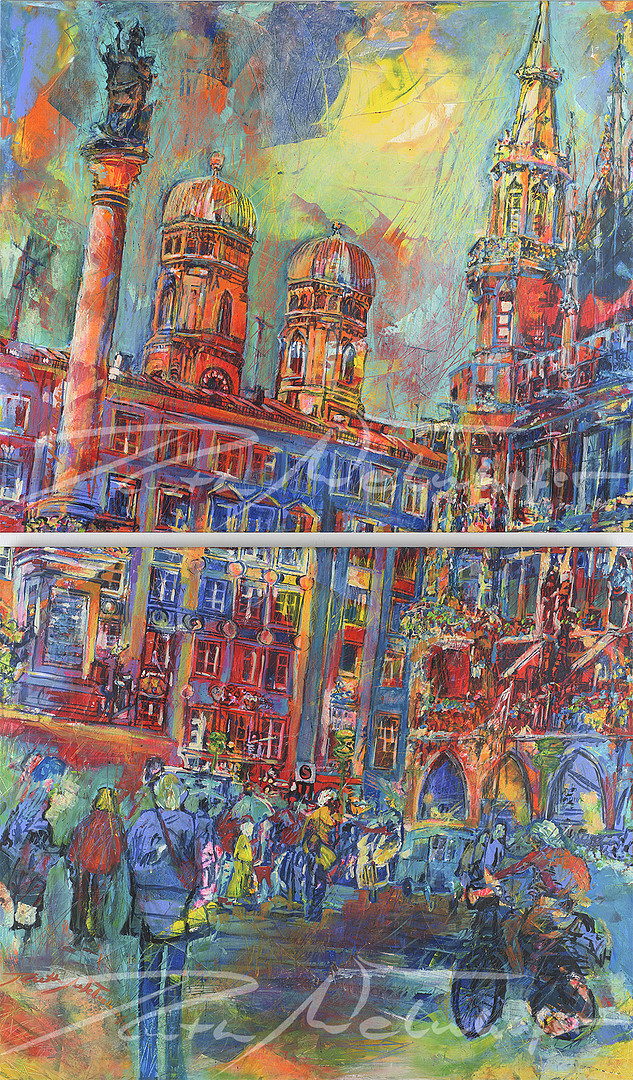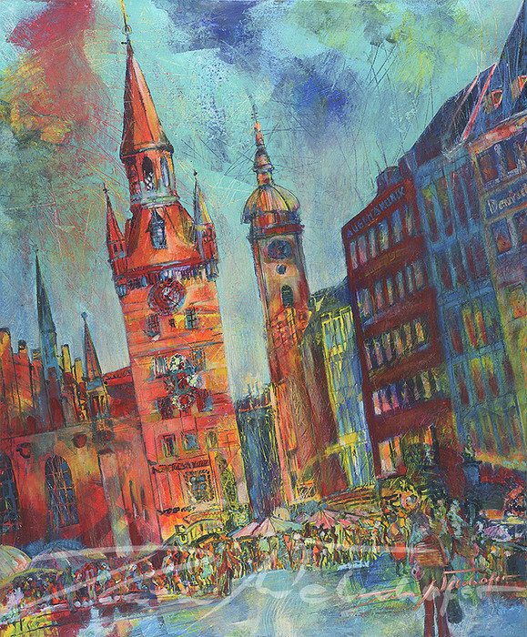 Mit dieser Technik hält die Künstlerin Ruth Welnhofer die unmittelbare Realität Münchens mit kraftvollem Pinselstrich in strahlend bunten Farben auf der Leinwand fest.